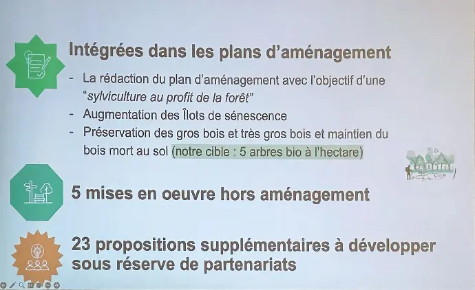 Les modalités concrètes et les surfaces réellement engagées pour les îlots de sénescence ne sont pas précisées. Les cartographies des invasives existent déjà, réalisées par l'association EFR sur de nombreuses parcelles.