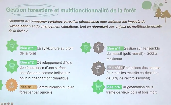Pour autant, des zones d’incertitude persistent, notamment sur les modalités concrètes et les surfaces réellement engagées pour les îlots de sénescence. De nombreux sujets restent en attente ou sans réponse : réduction de l’exploitation forestière, limitation des coupes rases, encadrement des travaux, renforcement du puits de carbone, diminution du recours au bois-énergie, ainsi que la transparence dans la gestion et sur les volumes prélevés.