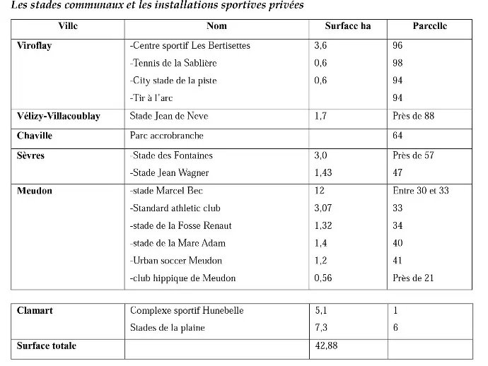 Chacune des six communes a le sien : Viroflay (p. 94), Vélizy-Villacoublay (p. 84), Chaville (p. 64), Sèvres (p. 52), Meudon (p. 23), Clamart (entre les p. 16 et p. 14) soit au total 42, 77 ha. Même si ces installations sont nécessaires, on peut s’étonner de leur position en forêt.